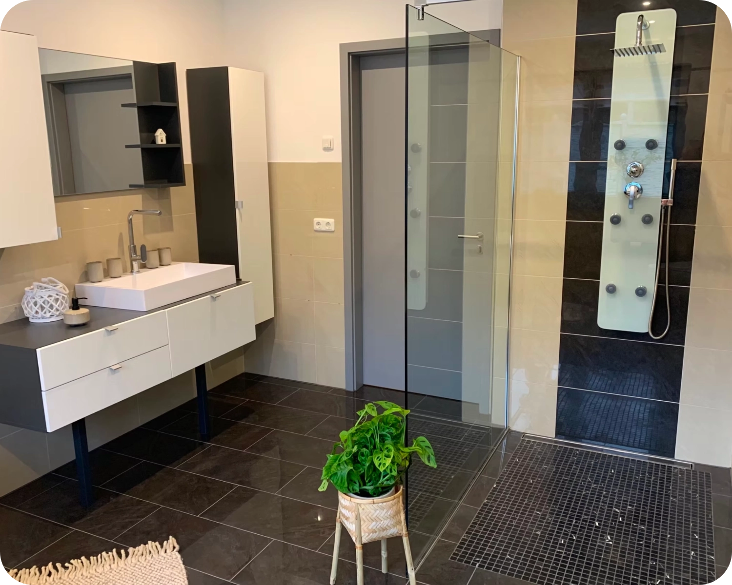 Tageslichtbad mit freistehender Badewanne, ebenerdiger Dusche und WC