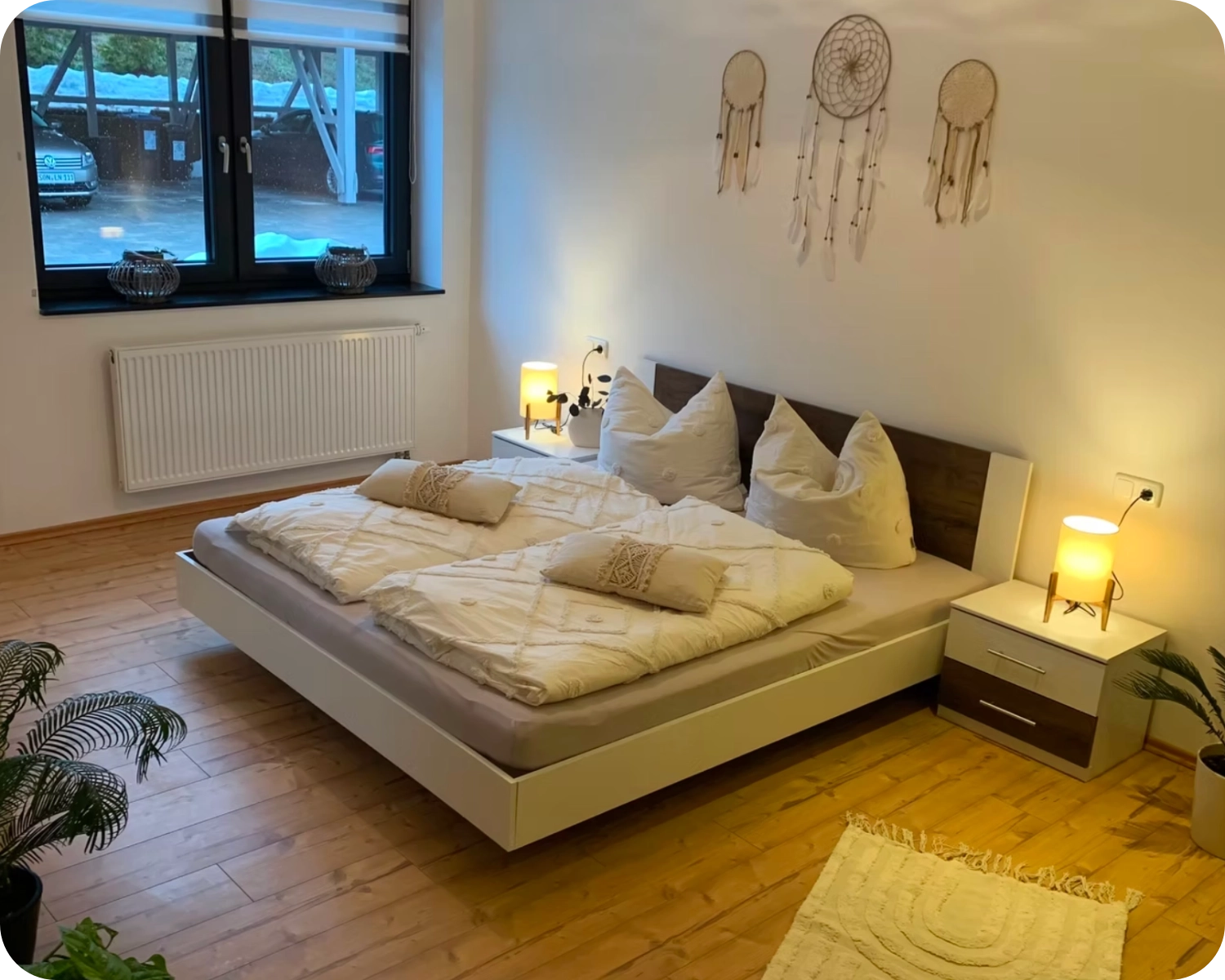 Ein ruhiges Schlafzimmer mit Doppelbett